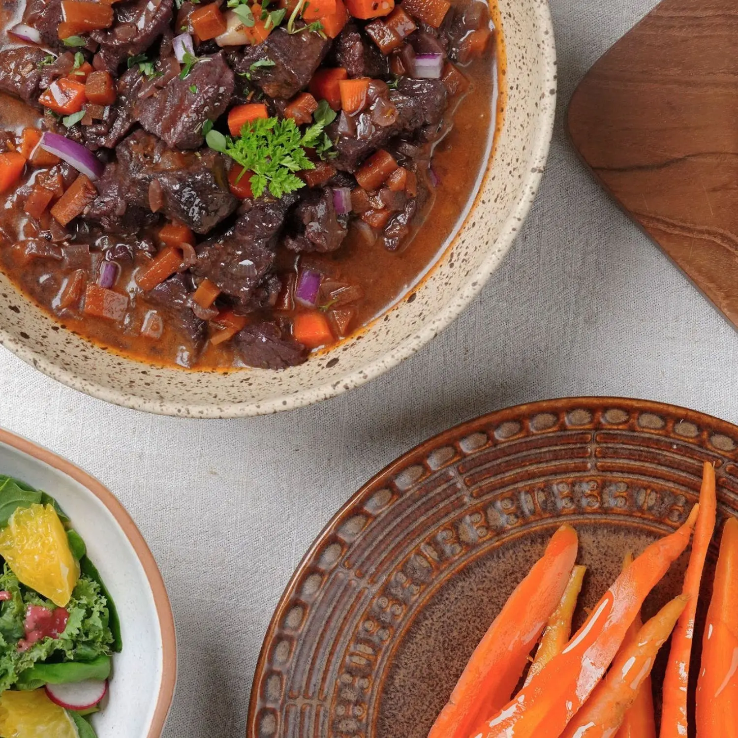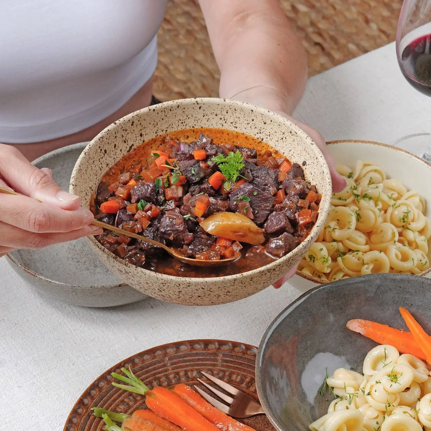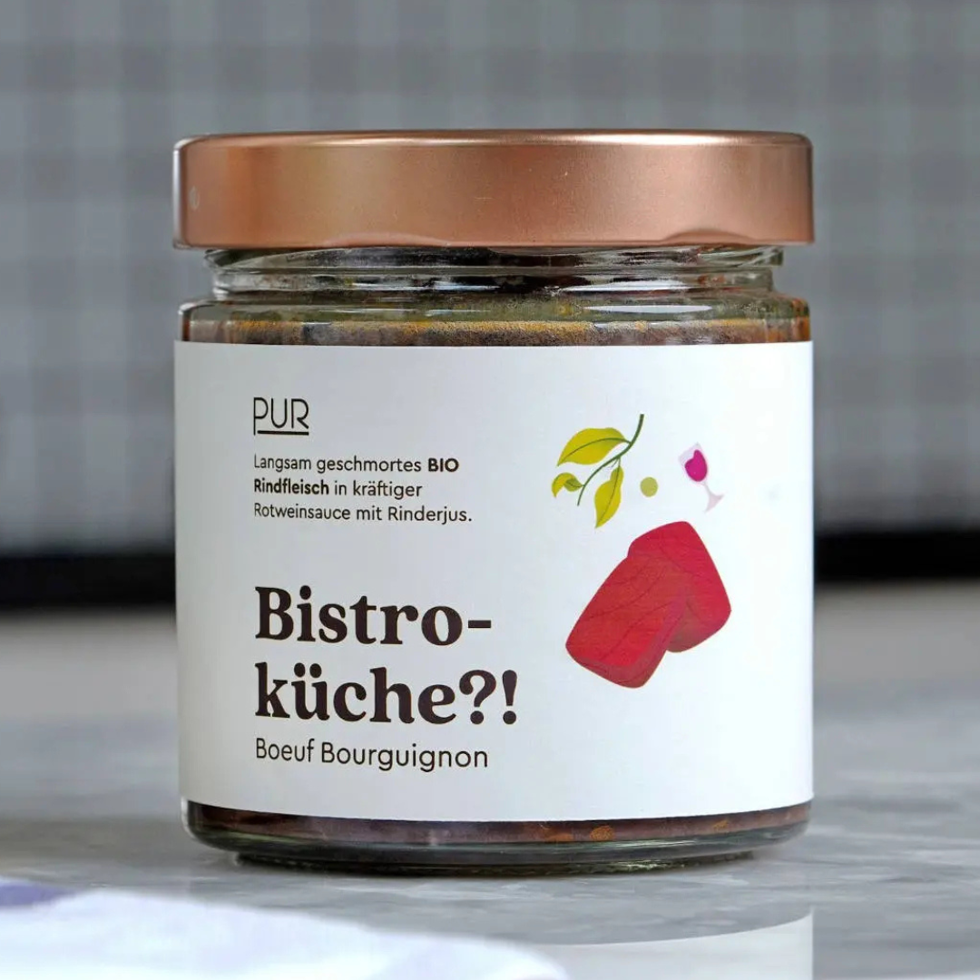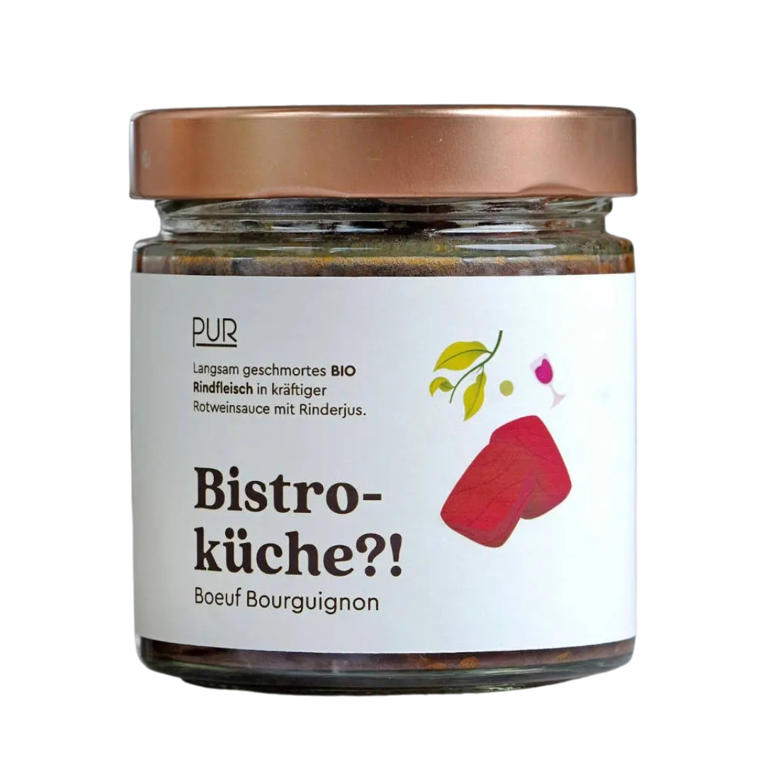 Unser Bio-Boeuf Bourguignon ist reich an Fleisch und kräftiger Sauce.
