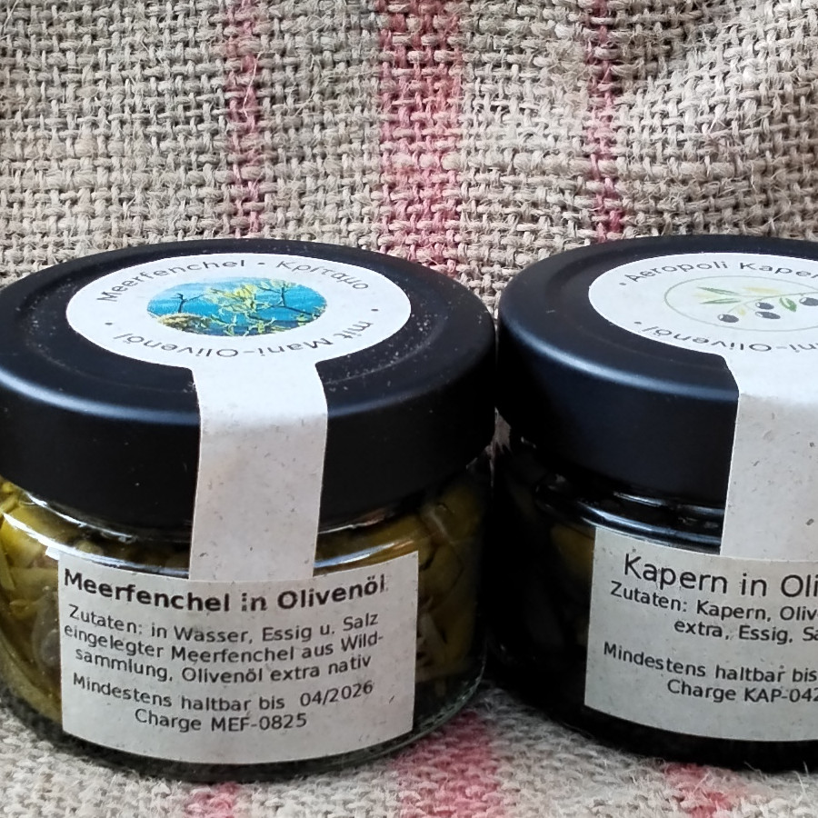 Unsere aromatischen Kapern haben wir ursprünglich auf dem Markt in Aeropoli, dem Zentrum des Kapernanbaus des südlichen Peloponnes, entdeckt und beziehen sie seitdem von einem ortsansässigen Händler. Nach der Ernte werden die Kapern klassisch in Wasser, Salz und Essig eingelegt. Vor dem Abfüllen wässern wir die Kapern, um den Essiggeschmack zu mildern um sie dann in feines Mani-Olivenöl einzulegen – für ein ausgewogenes, vollmundiges Aroma. So hat man nicht nur die Kapern, sondern auch das durch die Kapern aromatisierte Olivenöl, was einen herrlichen Geschmack ergibt.