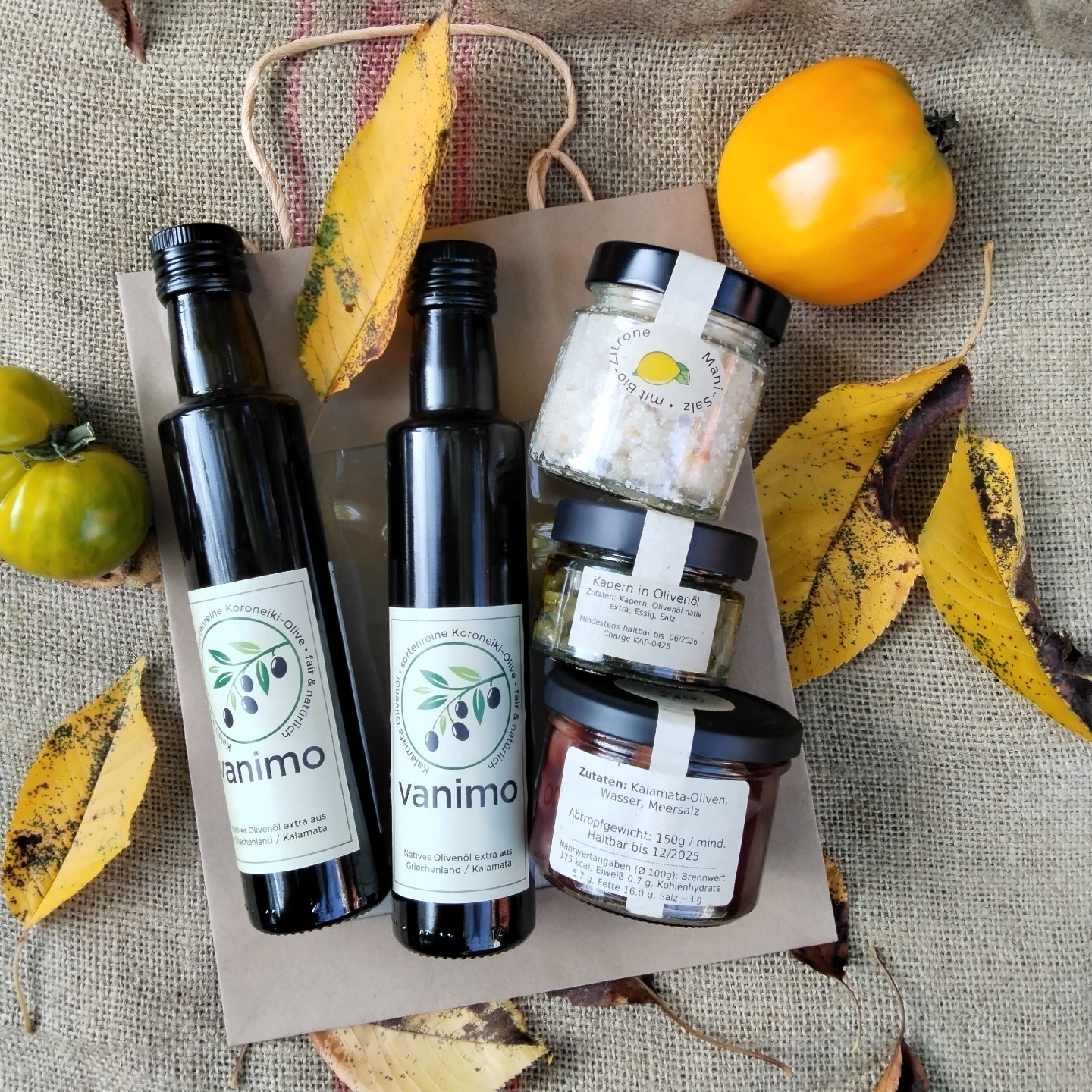 Extra natives Olivenöl der Sorte Koroneiki nach Wahl (Fläche Lykos, Karpofora oder Aris). Die Oliven wurden Mitte November 2024 geerntet und am selben Tag in der Ölmühle Vanavanis, Agios Nikolaos, Griechenland gepresst. Es wurden frische, grüne Oliven geerntet, das Öl leuchtet gelb-grün und ist sehr ausgewogen, man schmeckt den intensiven Geschmack, den die Bäume der Fläche im heißen Sommer und Herbst 2024 abgerungen haben. Das Öl ist ungefiltert und die Oliven werden nach Bio-Maßstäben angebaut, die Ernte erfolgt von Hand.