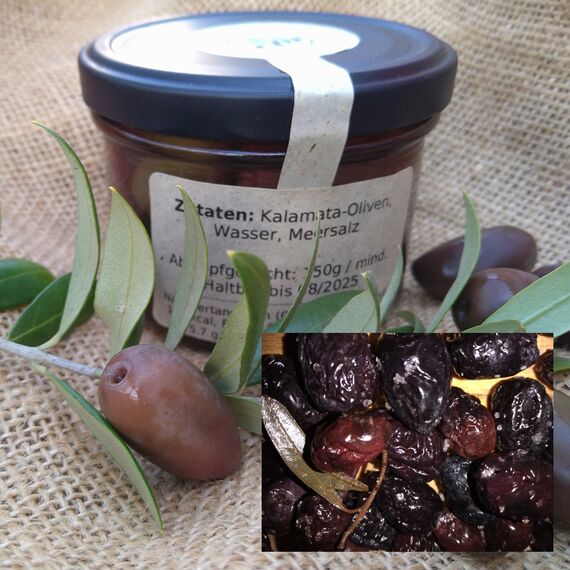 Inhalt: e150g. Zutaten: Kalamata-Oliven, Meersalz, Olivenöl