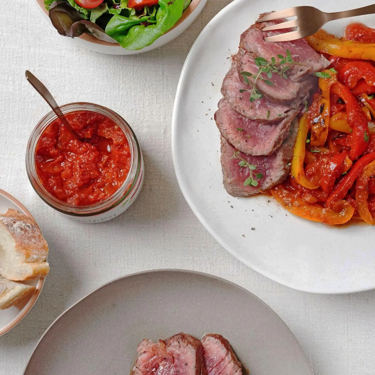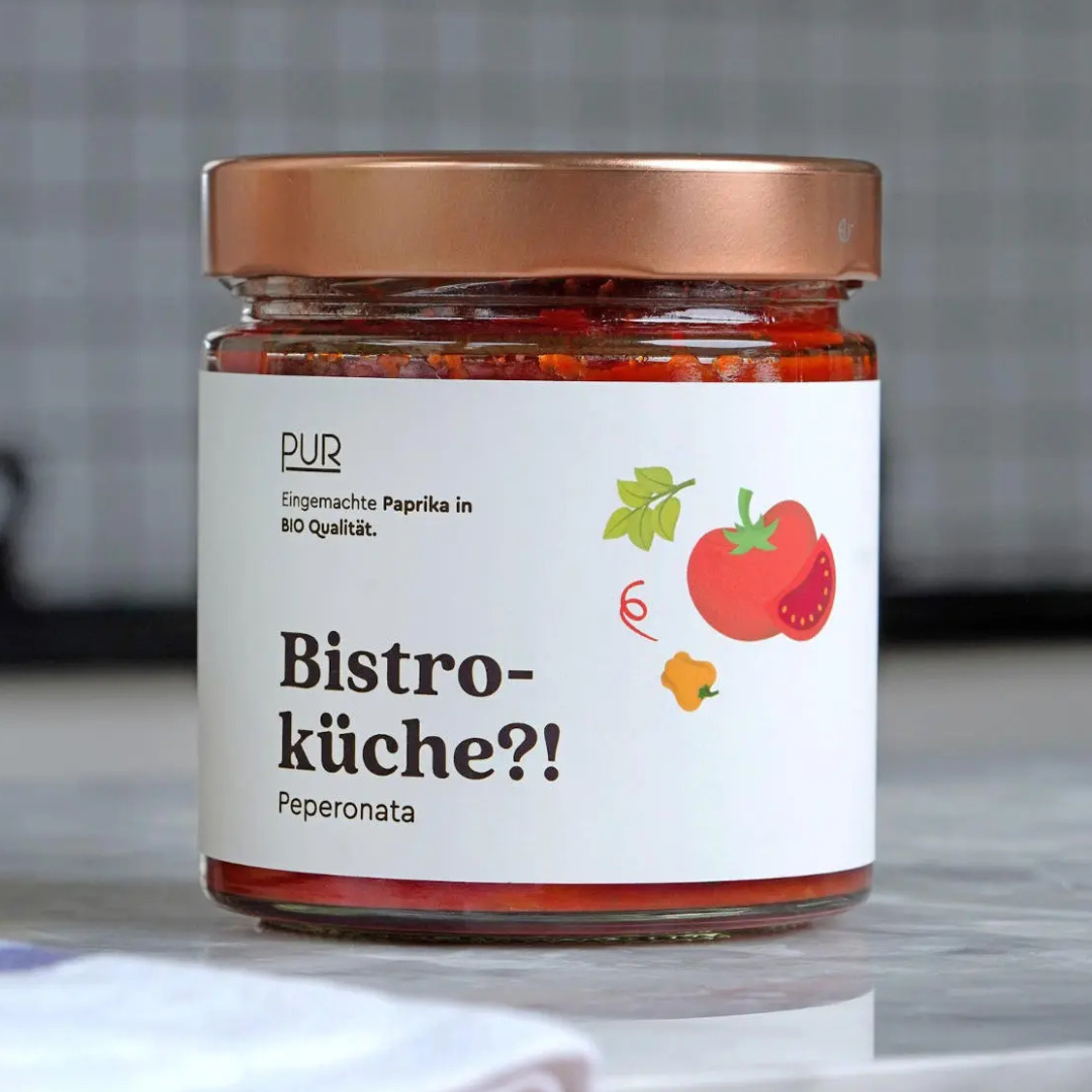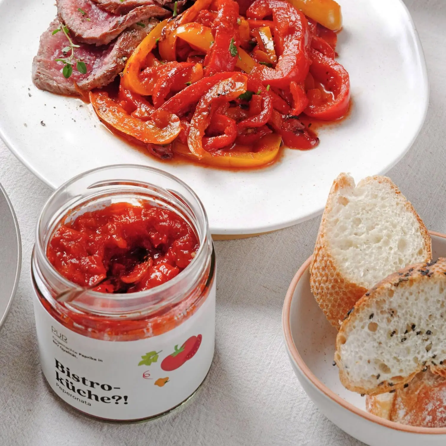 Was kommt dabei raus, wenn man sonnengereifte Paprika lange und schonend gart? Richtig, die typisch italienische Peperonata. Passt natürlich besonders gut zu frischer Pasta (welch Überraschung), macht aber auch im Salat oder als Beilage zu Fisch und Fleisch eine gute Figur.