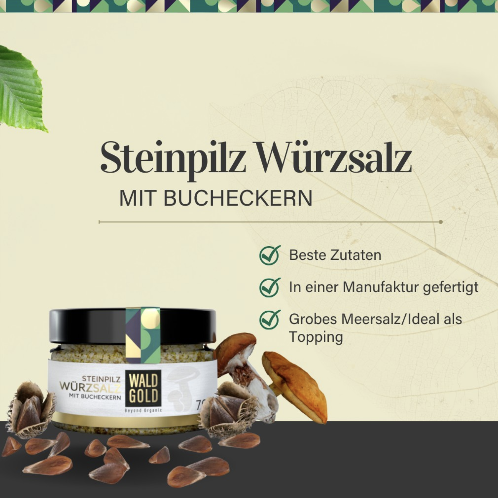 Mit unserem einzigartigen Steinpilz Würzsalz mit Bucheckern aus nachhaltiger Wildsammlung lassen sich im Handumdrehen tolle Gerichte zaubern.