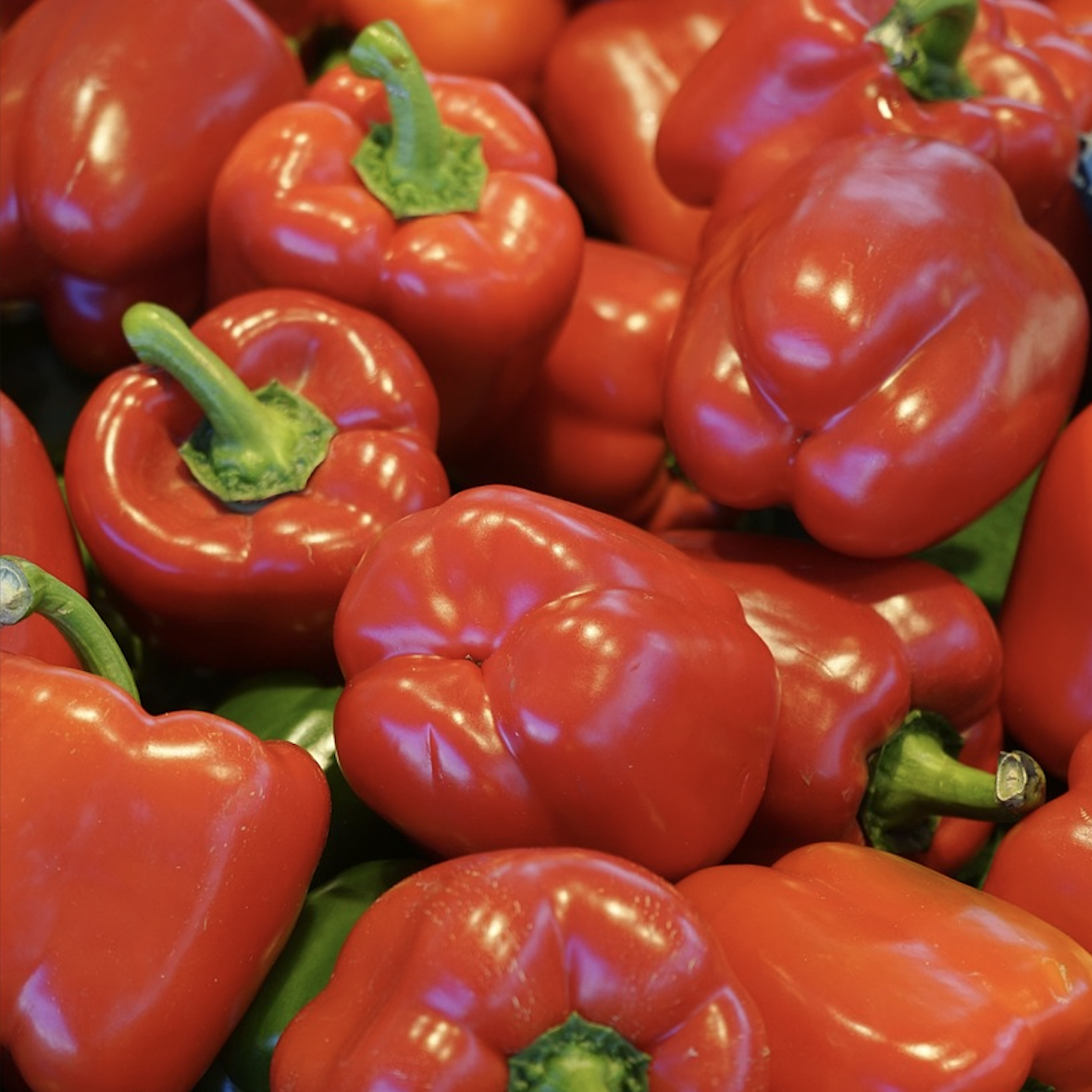Der rote Paprika, eine milde Sorte von Capsicum annuum, ist ein saftiges und fleischiges Gemüse mit dreieckiger bis quadratischer Form, glatter, glänzender und leuchtend roter Schale. Reich an Vitamin C (bis zu dreimal mehr als Orangen), Antioxidantien wie Quercetin und Carotinoiden wie Beta-Carotin, bietet er roh einen süßen, leicht fruchtigen und knackigen Geschmack, während sein zartes, schmelzendes Fruchtfleisch bei langsamen Garungen eine rauchige Note entfaltet. Ursprünglich aus Mittel- und Südamerika stammend, wurde er im 16. Jahrhundert durch spanische Entdecker nach Europa gebracht und hat sich zu einem Eckpfeiler der mediterranen Küche entwickelt, verwendet gefüllt, in Streifen gebraten für Salate, in der baskischen Piperade oder als gegrillter Begleiter.